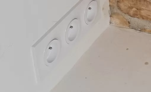 Installation d’un bloc de trois prises blanches pour un bureau.