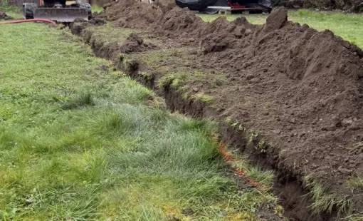 Passage de câbles en tranchée pour l’alimentation électrique d’une dépendance avec pose de coffret électrique, éclairage et prises de…